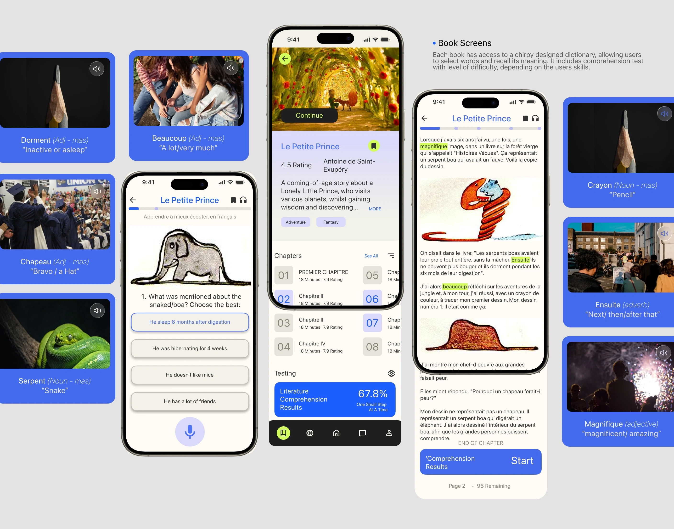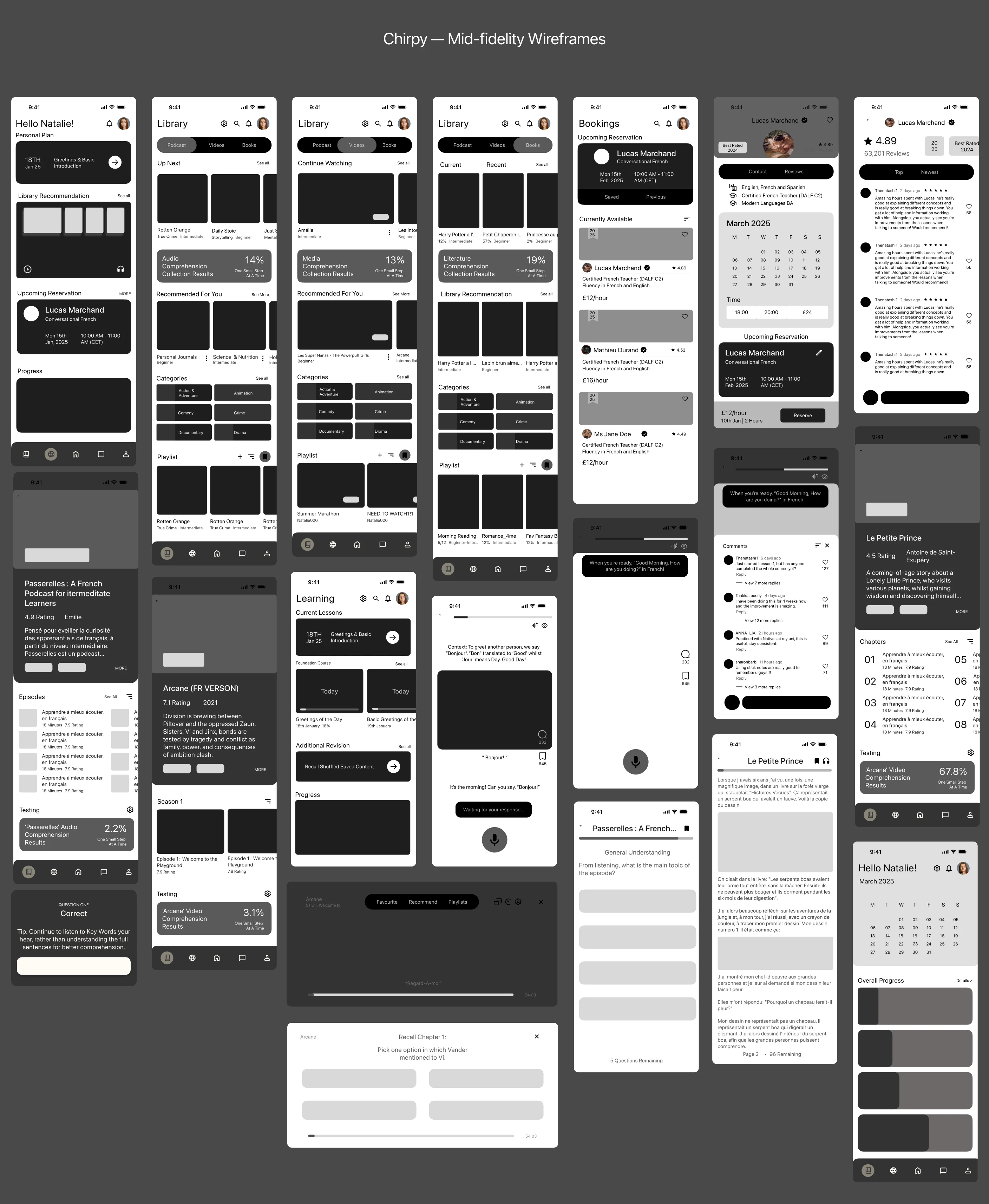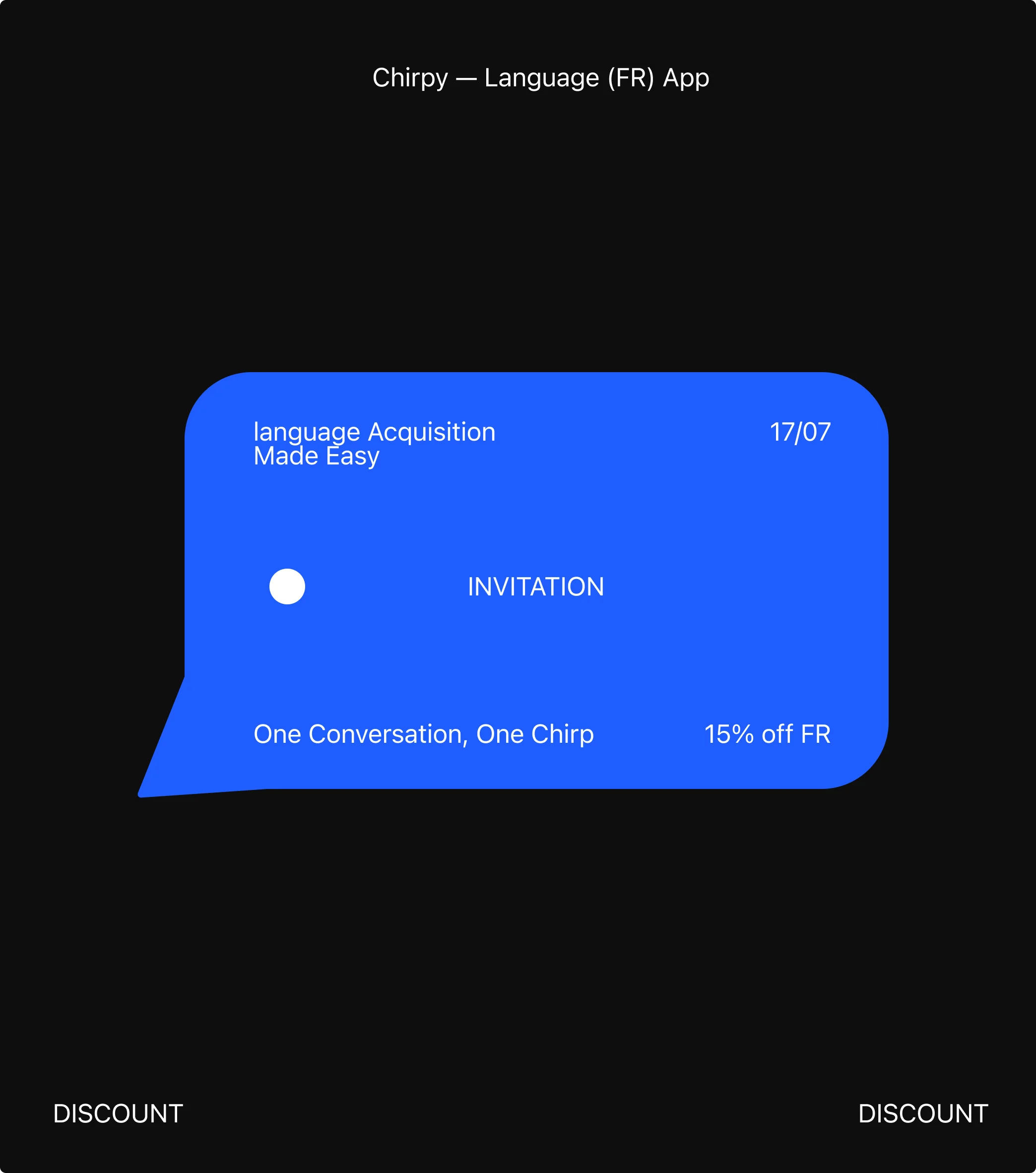 Chirpy is designed to bridge the gap of natural acquisition (spontaneous speaking), than explicit learning (memorisation). This project focuses on building an app with language acquisition practices, specifically testing French. It displays a clean san-serif typeface and minimalistic-modern visuals representing the academic and scientific approach to language acquisition.